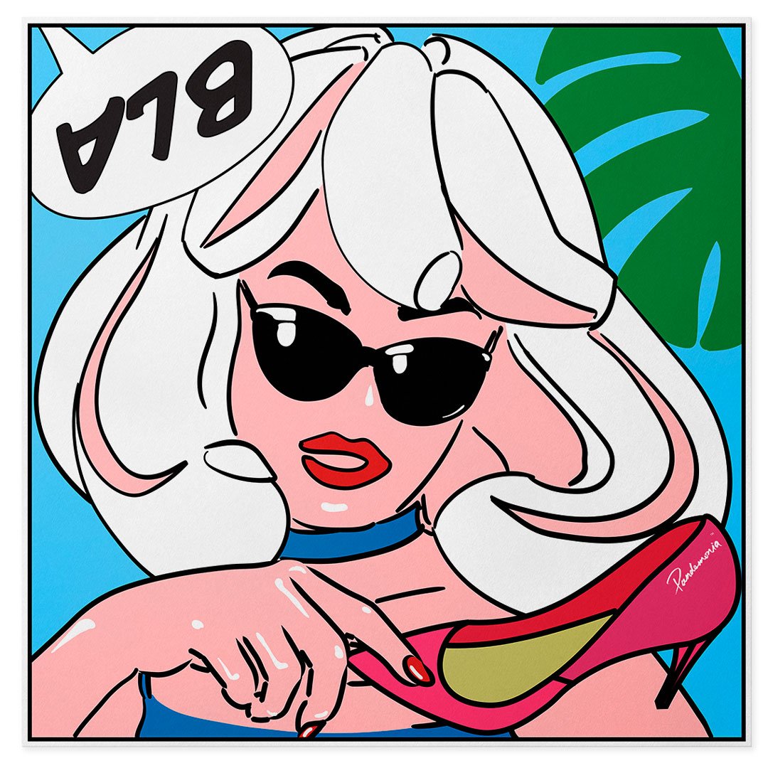 This 45 cm silk neckerchief features Pandemonia’s signature "BLA" motif—a graphic emblem of glamour, attitude, and pop spectacle. Rendered in bold colour blocks and clean comic-style linework, the design draws from advertising iconography, fetishised fashion details, and the language of desire.