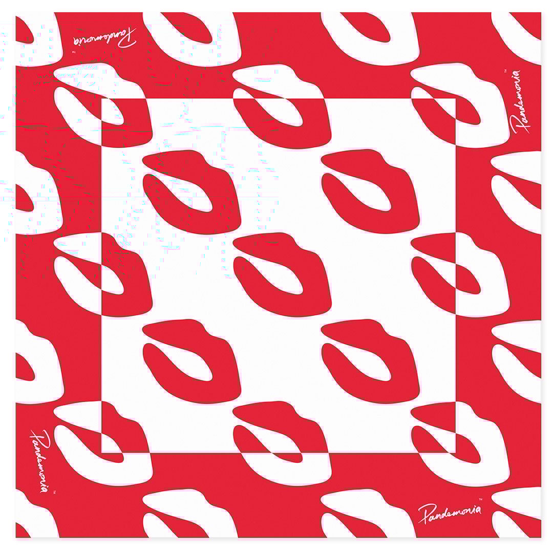 A signature Pandemonia motif transformed into wearable pop glamour. The Pandemonia Lips Scarf features the artist’s iconic lips motif repeated across luminous silk, turning the universal symbol of desire into a bold fashion statement.