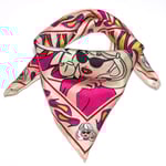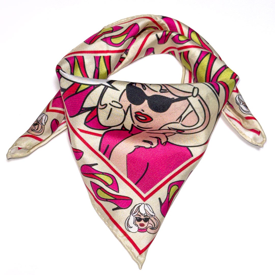A compact version of the signature Pandemonia Stiletto design, this silk neckerchief brings playful pop-art glamour to everyday styling. The graphic high-heel motif and bold colour palette make it an eye-catching accessory, while the smaller size offers versatile, easy wear.